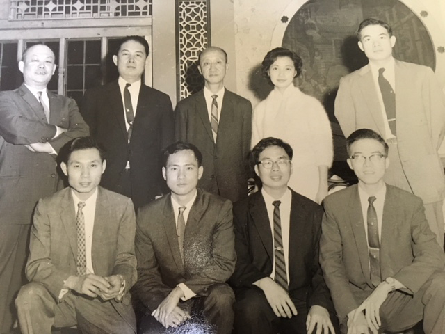 1958年何宗頣副校長(後排中立者)來訪波士頓。後排 (左起): 笫二位陳振祥 (35 覺社)、何君、陳碧婷 (58 鋭社)、陳振煥 (53 誠社)。前排 (左起): 第三位司徒榮植 (50 弘社),其他同學不詳。